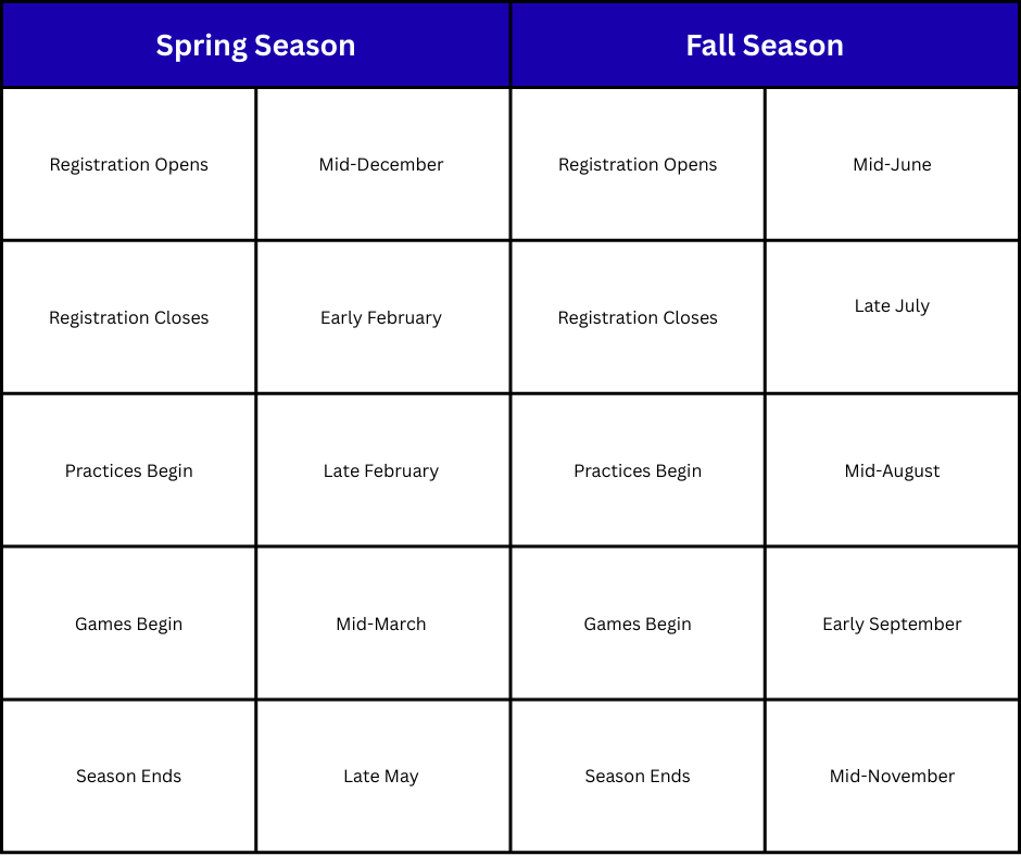 Teams typically play 2 games per week depending on the age division. Weeknight games start as early as 6:00 PM. Saturday games start anytime between 9:00 AM and 6:00 PM.